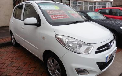 HYUNDIA i10 AUTOMATIC ACTIVE 1.2 IN WHITE WITH CONTRASTING TRIM, COLOUR CODED BUMPERS, MIRRORS & DOOR HANDLES, P.A.S. REMOTE ALARM & CENTRAL LOCKING,AIR BAGS, ELECTRIC WINDOWS X 4 & MIRRORS, AUX SOCKETS 12v ,AIR CONDITIONING, HEIGHT ADJUST DRIVERS SEAT, ALLOY WHEELS, MATS F & REAR, F & R FOGS, SPARE WHEEL AND TOOLS, SERVICE HISTORY WITH ONLY 47,000 MILES